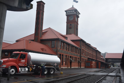 Elizabeth and I woke up at the County Inn and suites in The Dalles after a restful night of sleep and after packing up and checking things on the Internet, we checked out. After McDonald's hot cakes and sausage while Elizabeth had her usual breakfast, we drove Interstate 84 through just a couple of rain showers back to Portland Union Station. Elizabeth first checked her large suitcase all the way to Santa Ana. Then she came back and took the rest of the luggage to the Metropolitan Lounge and checked herself in. I returned the rental car then walked back to the Convention Center Max station and took the train back to Chinatown. My walk was interesting as I passed many homeless camps on the the way back to Portland Union Station. I found Elizabeth there who was on line and I joined her, cleaned out my E mail and watched the trains go by outside the lounge on the mainline. I got a Coca Cola and a Sprite for later in the trip and then waited for the Coast Starlight to arrive into Portland this afternoon. The train arrived at 1:41 PM today.