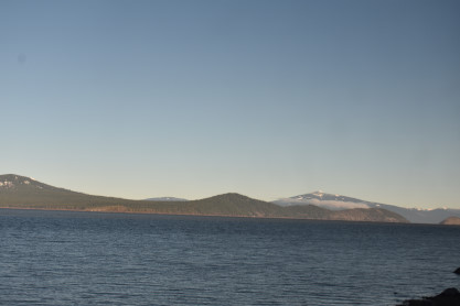 Upper Klamath Lake. I listening to a Rachel Flowers CD "Going Somewhere" to start off my musical day and spotted Mount Shasta in California. Next it was back to the DVD of "Queen Live at Wembley Stadium". The train departed Chemult on time and headed next to Cascade Summit. Later, we had to stop for climbing Union Pacific 8816 West at Cruzatte. Back on the move again, it was time for two pictures.