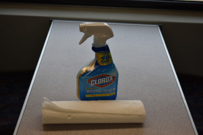 I used Clorox Clean-Up Cleaner with bleach to sterilize not only the tabletops, but the sides of the table, between the seats, the bottom of the window area and the head rest. Every train I ride gets that treatment. So I was able to ride and all was good.