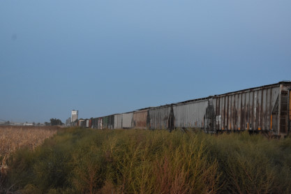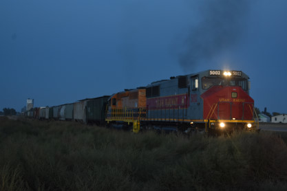 This Kyle train had just two units, Utah Railroad MK-3 5002 and Buffalo and Pittsburgh SD-40-3 3341, with a very long grain train.