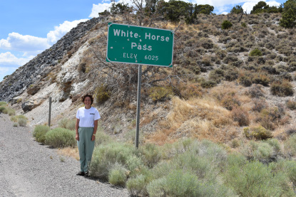 Elizabeth at White Horse Pass on Alt 93. We then drove to US 93 and stopped at the railroad crossing short of Cherry Creek for Elizabeth's first look at the Nevada Northern and had a surprise.
