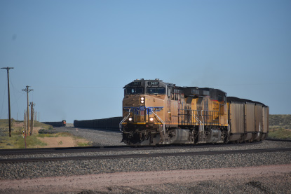 Union Pacific 5653 South with DPU Union Pacific 2645 and 7682 at Flat Top Road. From here, we went to the overpass a few miles south of Bill, Wyoming.