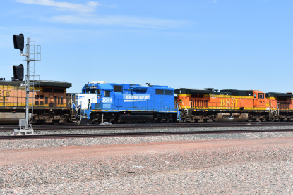 BNSF GP38-2 2044 nicknamed "The Smurf", built by Electro-Motive Division in 1970 as Baltimore and Ohio GP38 4811, was in one of the stored power lines at Donkey Creek Yard.