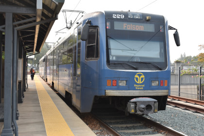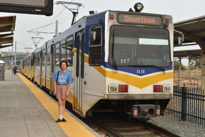 Elizabeth is ready to make her first trip on the Sacramento Light Rail. We boarded the unwrapped car for the trip to Historic Folsom.