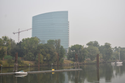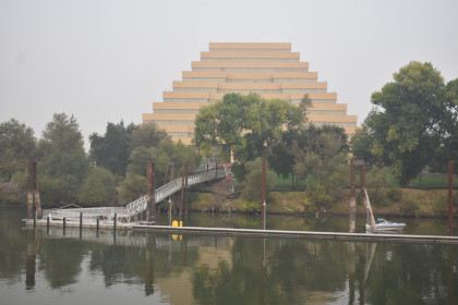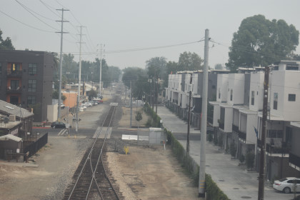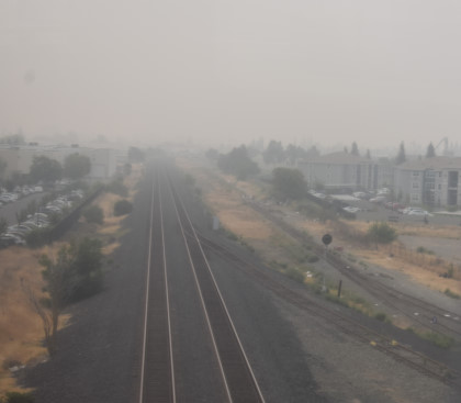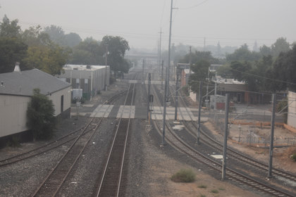 A Capitol Corridor train crosses the Sacramento River. First we had a free breakfast and I had smokewood bacon, sausage, potatoes and toast plus orange juice which hit the spot this morning. Due to COVID-19 health restrictions in Sacramento, we had to sit outside in the cool air which did not bother either of us.