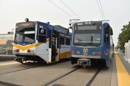 Crossing the former Southern Pacific main line. At Sunrise, our train was taken out of service and we had to walk around the front of it to the train on the right for the rest of the trip to Historic Folsom.