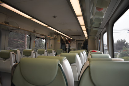 Rolling stockThe SMART fleet consists of nine two-car Nippon Sharyo DMU trainsets. Each DMU car is powered by a Cummins QSK19-R diesel engine. The vehicles, designed specifically for SMART and another transit service, the Union Pearson Express in Toronto, Ontario, Canada, are slope-nosed and self-propelled by diesel engines that meet stringent "Tier 4" EPA requirements. For regular service, SMART runs DMUs in pairs or triplicate. Trains may be as long as station platforms provided there are cabs facing the outer ends. The diesel multiple unit trainsets were ordered from Sumitomo Corporation of America / Nippon Sharyo at a cost of $46.7 million, or $6.67 million for each two car set. They were delivered to Rochelle, Illinois, for assembling, and then sent to the Transportation Technology Center, Inc. in Pueblo, Colorado, for testing. Under the contract, additional railcars may be ordered at a cost of $2.9 million per individual car. The first trainset arrived in Cotati, California, on April 7, 2015. The original order was for fourteen cars in seven two car trainsets, but on July 30, 2015, the state of California announced an $11 million grant to SMART to finance the purchase of three additional cars to be added to the fleet, allowing for three trainsets to be run with three cars, with an increase in capacity of 130 passengers over a two car trainset. In April 2016, SMART's general manager negotiated with CalSTA and Nippon Sharyo to adjust the order so SMART will receive two more full trainsets in place of the extra cars, bringing their fleet size to the required nine trainsets needed for service to Cloverdale. They will be painted in a McGlashan green livery. A July 2016 fire aboard one of Toronto's Nippon Sharyo units revealed a design flaw in the engine's crankshaft that would result in premature wear; SMART decided to delay operations until the engines could be serviced to correct the problem. All trains were refurbished at SMART's rail center by April 2017.