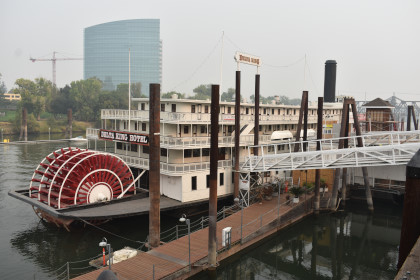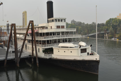 The paddlewheeler Delta King berthed at Old Sacramento. It is a 285-foot-long sternwheel steamboat and the sister ship of Delta Queen, built in Scotland and California for the California Transportation Company's service between Sacramento and San Francisco. She entered service in 1927 and continued until 1940. After wartime service with the United States Navy, Delta King served as an accommodation ship at Kitimat, British Columbia in the 1950s and then returned to California for static use at Old Sacramento where she remains as a hotel, restaurant and venue.