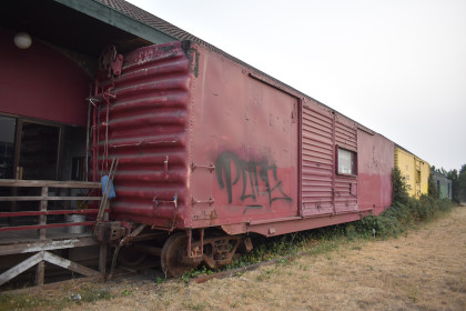 The Northwestern Pacific station in Petaluma built in 1914. Next we walked over to some railroad equipment we discovered which belongs to the Petaluma Living History Railroad Museum, which celebrates the Petaluma and Santa Rosa Railroad history. Their efforts include restoration of PNSR equipment and the iconic Water Street Trestle.