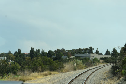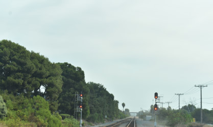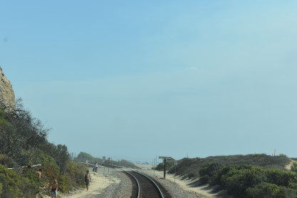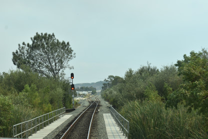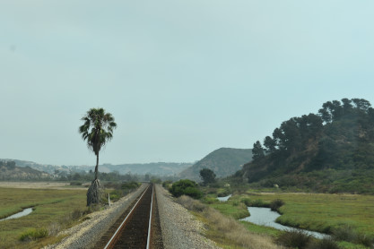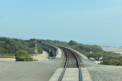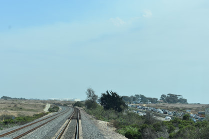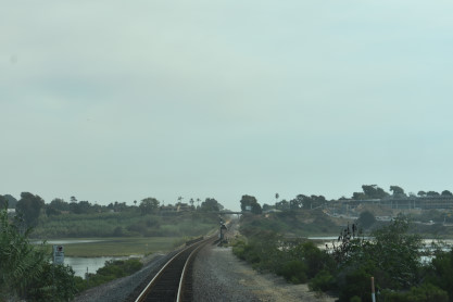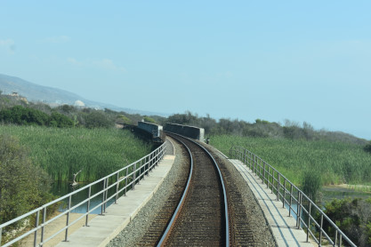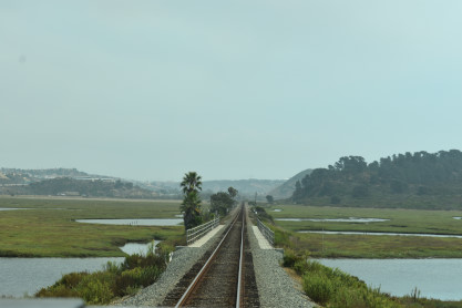 The train crossing the lowlands on the way to the Coast Highway bridge.