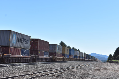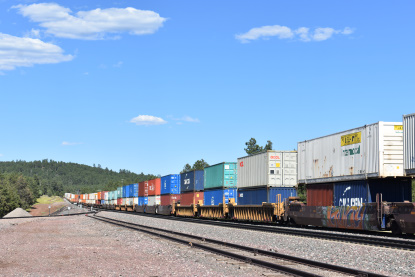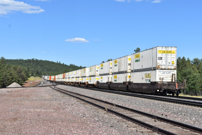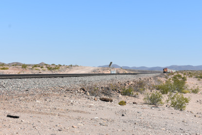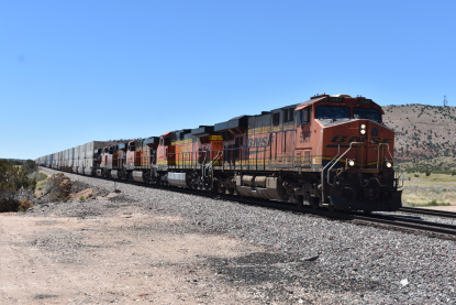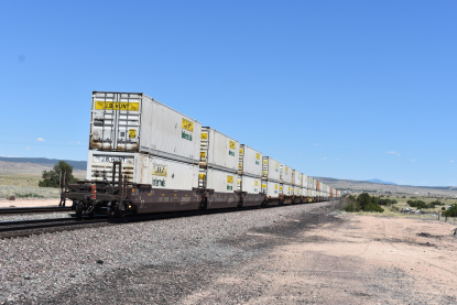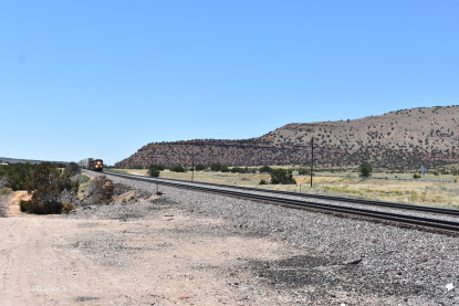 BNSF 8431 East near Siberia. We went east on US 66 to Kelbaker Road due to US 66 still being closed for repairs. We then took Interstate 40 to Goffs Road and stopped in Goffs for the replica station. We continued on Goffs Road to US 95 and back to Interstate 40. We switched drivers and Elizabeth drove to Kingman where we stopped at the old Santa Fe station for a picture. I then drove us to Arby's for lunch and were able to sit in the restaurant for lunch since Arizona is doing things differently from California. Our high temperature for the day was 109 degrees which was just outside of Needles. We missed a train at the west end of Crozier Canyon but caught up to one and passed it on the way to Seligman where we pulled off and waited.