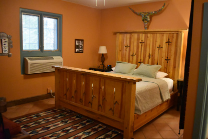 The king-size bed with the unique steer horn artwork above.