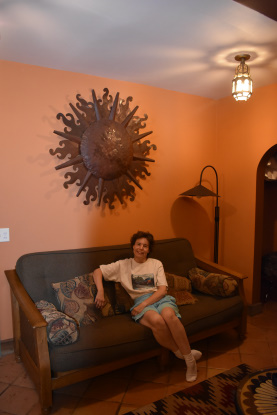 The couch and the sun sculpture.