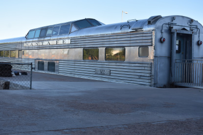 Santa Fe Pleasure Dome 502 "Plaza Lamy" built by Pullman Standard in 1950. The name was never applied to the car. It later became Amtrak 9352 then in 1982 it was transferred to Kyle Railways then Dr. Dan Marnell "Plaza Lamy" (PPCX 800403), followed by the Sierra Madre Express and Santa Fe Southern Railroad in 1999. I rode this car on my last trip on the Santa Fe Southern. It was moved to Winslow in 2016.