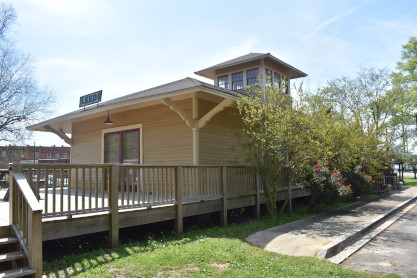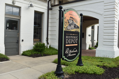 The station sign for the museum. Part of it houses the Decatur Police Department.