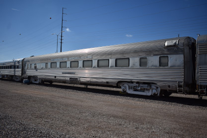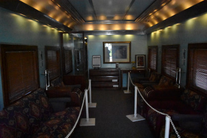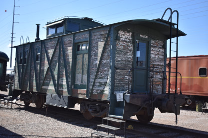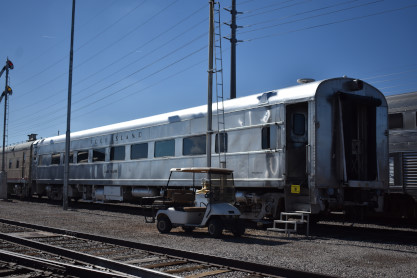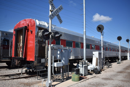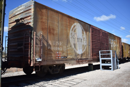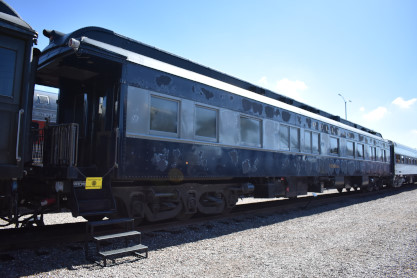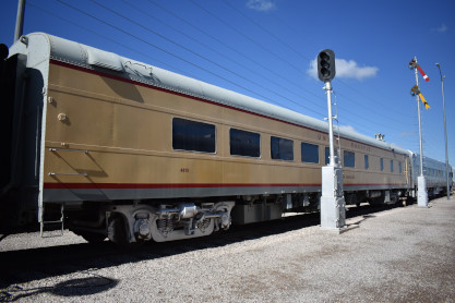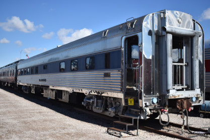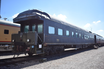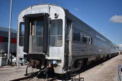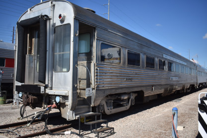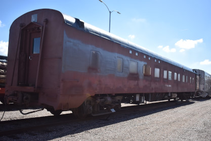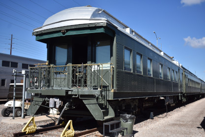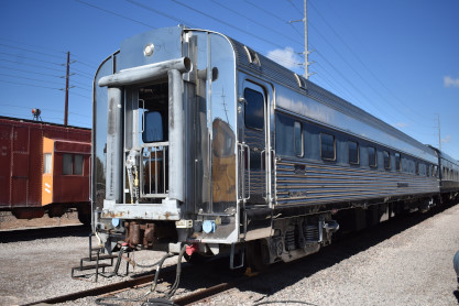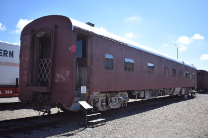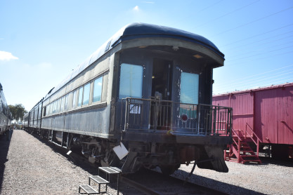 Santa Fe observation car "Denehotso" which also featured 1 double bedroom/4 drawing rooms and a 17-seat lounge, built by the Pullman Company in 1938. It saw service on the Super Chief between Chicago and Los Angeles (via northern Arizona). Santa Fe rebuilt the car in 1954 changing the round end to a blunt end and adding one seat to the lounge. While on the Santa Fe, the car also carried the number 1853 which was for inventory purposes only. The car was retired in 1968 and donated to the Steamtown Foundation in Bellows Falls, Vermont. Steamtown later moved to Scranton, Pennsylvania and some pieces of equipment were sold at auction. This car was sold to Bill Fuehring who sold the car to museum member Mike Salwitz. The museum purchased the car from Mr. Salwitz in 1995. This car is the only remaining observation car from the original train set; the other cars were rebuilt to coaches in the mid 1950's and later scrapped. The "Denehotso" was placed on the Arizona State Historical Register in 1995.