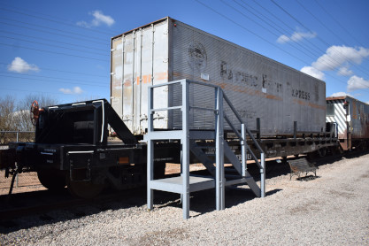 A Marmon Transmotive Company Model 9000 "Switchmaster" which was used by the Arizona Republic newspaper printing facility in Mesa, used to move boxcards loaded with bulk printing paper.