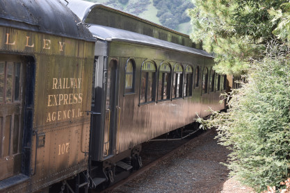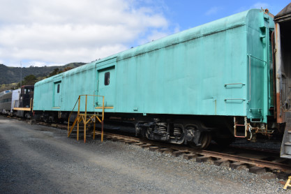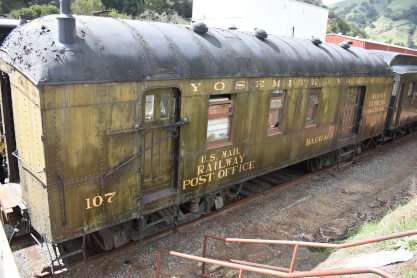 Yosemite Valley Railway baggage/railway post office car 107, built by Pullman in 1911 as Texas and New Orleans 193. This was the first piece of passenger equipment acquired by the Pacific Locomotive Association in 1968.