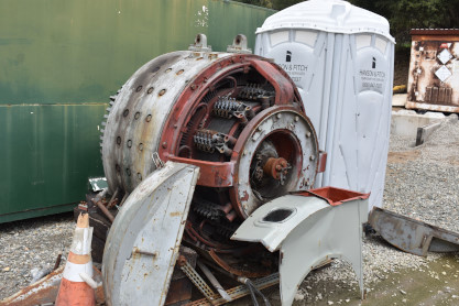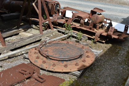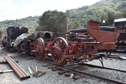 Clover Valley 2-6-6-2T 4 built by Baldwin in 1924 under restoration. In late 1956, the Clover Valley Lumber Company sold out to the Feather River Lumber Company, but the rail operation remained the same. In late 1957, the railroad became history when the logging operation switched to trucks. It was at this time that 4 was sent to the Tahoe Timber Company's mill near Reno for stationary boiler service. That service lasted only a few weeks, but the locomotive was to remain there for many years. Between 1978 and the end of 1985, the steam engine was in regular operation at Castro Point. In addition to passenger operation, she was also called on to carry out special operations on occasion. One of these was the movement of the former Western Pacific F7, No. 918, into our facility at Molate Beach in 1982. On December 1, 1985, 4 had the honor of handling the last passenger movement on the Castro Point Railway. When the 4 arrived at Molate Beach, the passenger-carrying days on the railroad were over.