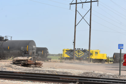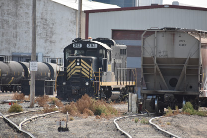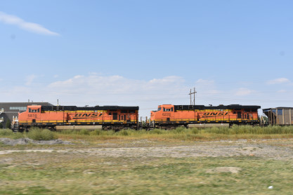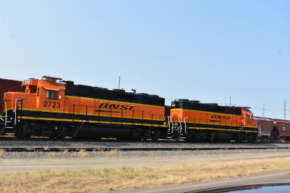 BNSF GP39-2 2723, built by Electro-Motive Division in 1981, and BNSF GP39-2 2773, nee Santa Fe 3655, built by Electro-Motive Division in 1975. Garden City Western Railroad, a shortline owned by Pioneer Lines since 1999 and operating fory miles of track, interchanges with BNSF here.