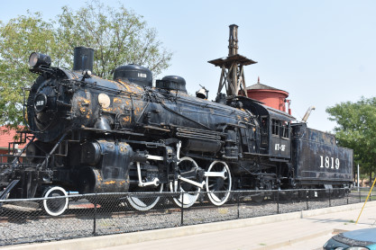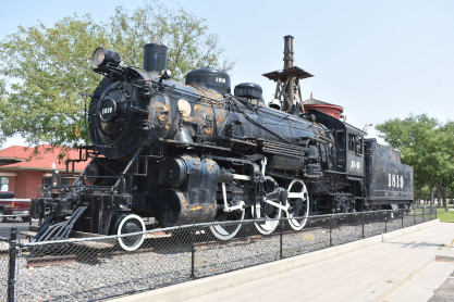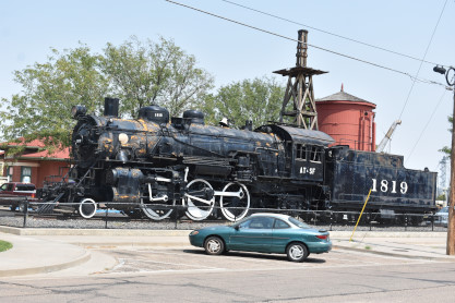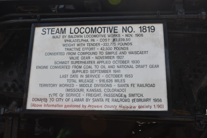 Santa Fe 2-6-2 1819 built by Baldwin in 1906 as a coal-burner but converted to oil in 1941. 1819 worked on the AT&SF's Missouri, Kansas and Colorado divisions and was last in service in October 1953 having clocked 916,626 miles. It was donated to the town in 1956.
