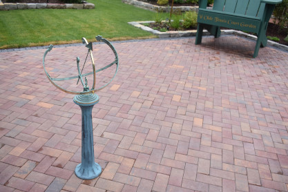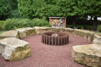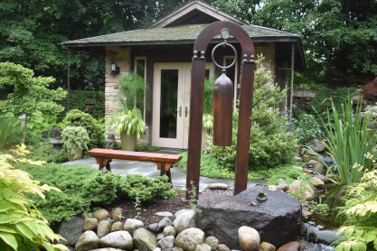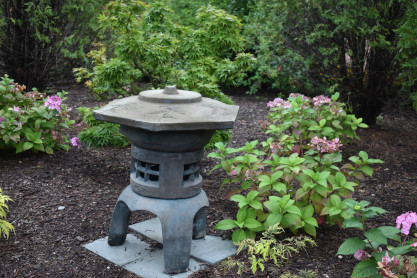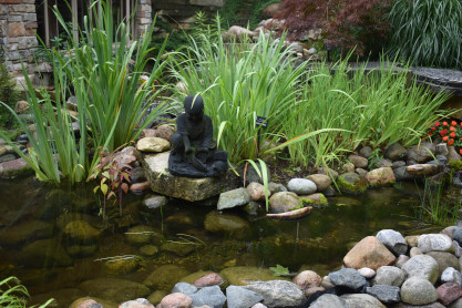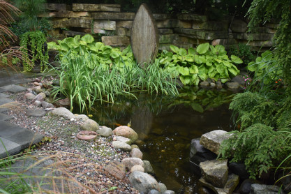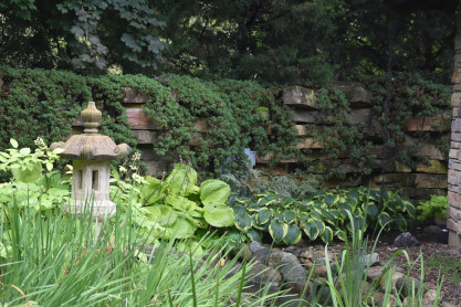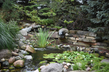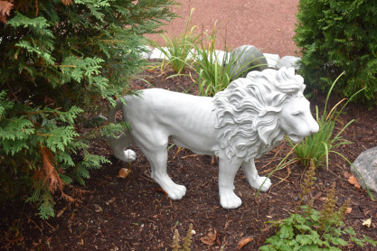 A statue of a lion. We went into the former tennis courts with a koi pond.