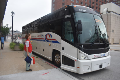 The bus arrived with my loving wife Elizabeth in this picture. She took my ticket and I boarded as the first person on the bus. We left when we had 27 passengers and drove to Sheboygan.