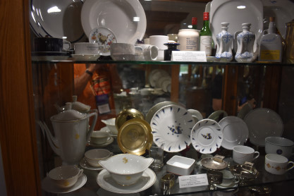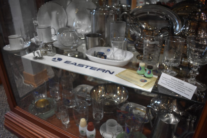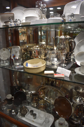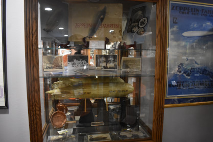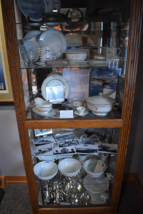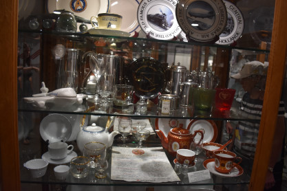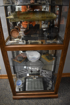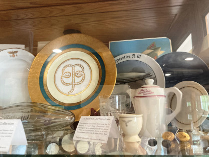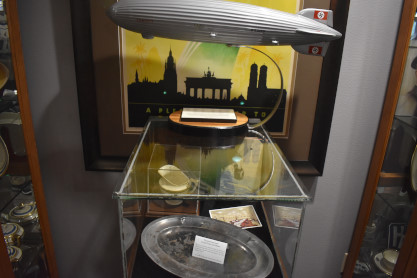 A model of the Hindenburg along with a surviving cream pitcher and platter.