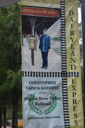 Dairyland Express HistoryAll Aboard! The Dairyland Express first pulled into the farm in June 2010. The 16-inch gauge amusement park train powered by a Wisconsin gas engine has three cars to accommodate 18 adults or 36 children. Built in the 1950s, the train required more than a year of restoration beginning with a new engine and finishing with a green and gold paint job. The color scheme is in honor of the Green Bay Packers, of course, but also in remembrance of the Chicago and Northwestern railroad that once spanned from Chicago through Wisconsin. Mr. Christopher has wonderful memories of riding that train to visit his grandparents in Manitowish, Wisconsin. The track this train once ran on is one mile west of the Farm property. The train track was laid within two weeks by a team of college summer workers lead by Alex Beams, a 16-inch gauge train expert. Passengers can ride the train on a quarter-mile loop that wends its way through scenic surroundings. Highlights include a waterfall, spruce haven, train station, depot and a 92-foot tunnel, which houses the train when not in use. The Pigeon River Valley Railroad is named after the river valley in which it resides.