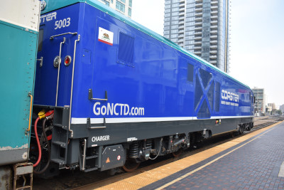 The rear of the SC-44 Charger 5003 in San Diego. We reboarded the first car and met Mitchell who reads my web site and was down here for the same reason as the three of us. We returned to Oceanside to a big surprise for all of us.