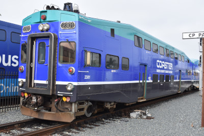 Coaster repainted Cab Car 2301 at Stuart Mesa. These cars will be replaced by the modern Bombardier cab cars when the order arrives and will then be retired.