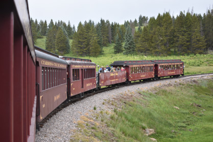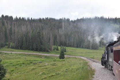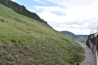 In all my years of train riding, this is a first being delayed by a hot box on a steam train. The crew retrieved their fixing equipment from under the open car. The crew working on the problem and after an hour had it fixed and off we went. We still had a chance of having lunch with Bart and Sarah. The view while we waited. We took off and continued up the four percent grade. The purple flowers are called lupins which is a joke to me as in Monty Python's Dennis More skit. Climbing through the curve which I took pictures of during my 2016 chase. The lupins are sure beautiful when they bloom. Curving to the right on another curve. Curving to the left as we climbed the grade. Curving to the right. Curving at the Cresco siding. The Cresco water tower. Curving out of the Cresco area. Another beautiful mountain peak along our route. The dead trees are from a bark beetle invasion of Colorado that killed off a lot of the trees. The train climbs another right-handed curve. Looking back down the valley. Coming into Coxo and we crossed Colorado Highway 17, the third crossing of the road. Windy Point which also has many caves on it. Coxo siding. After passing Coxo siding, the skies opened up and poured down rain and hail so we came back to our seats. During the rainstorm, the drivers of the engine started to slip. We came to a stop and they backed up and tried to go up the grade again. We climbed a little bit more and the same result, the wheels slipped. It was then decided to back down the tracks and drop off the last four cars. Our cars