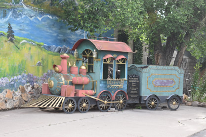 Elizabeth and I woke up in Chama, did our usual Internet things before going in search of breakfast. However, Chama is a very small community and as restaurants were open for the Fourth of July weekend, they closed this day, Tuesday, so none of them were open. We got into the car and found Speedway Gasoline station open and I bought two packs of doughnuts and and orange juice and Elizabeth had an apple fritter and orange juice. After I talked to Sarah Jennings last night, I learned that she and Bart were in Alamosa and riding from Antonito to Osier today. Our plan was to ride from Chama to Osier and meet them for lunch. In a perfect world, this would have worked. We came back to the room and I wrote the Pike's Peak story while Elizabeth caught up on e-mails. At 9:00, we walked over the road to train station, picked up our tickets and purchased two steam engine lapel pins for the engine we would be riding today.