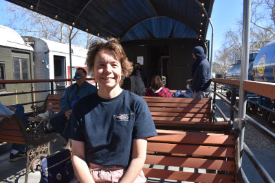 Elizabeth, maskless for this picture, making her first trip aboard a Fillmore and Western train. We departed at 12:00 noon for Santa Paula, our first stop of the trip. Masks were required aboard this train and the Fillmore and Western had caution tape between the seats so that social distancing would have to take place, following the guidelines of Ventura County. The consist of this train was S-6 1059, open car 904614, open car 8017R, coaches 2551, 1107 and 2553 and baggage 3884.