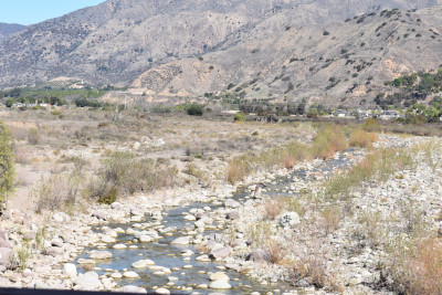 The engine crossing Grande Avenue on the west side of Sespe Creek.
