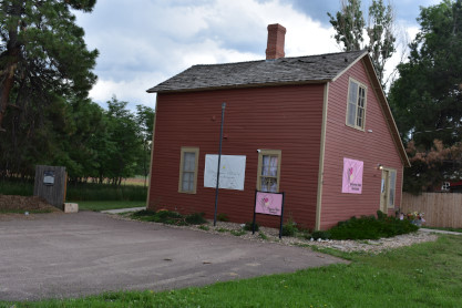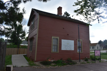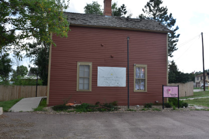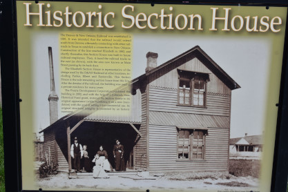 The Elizabeth Section House historical marker which reads "The Denver & New Orleans Railroad was established in 1881. It was intended that the railroad would extend south from Denver, ultimately connecting with other railroads in Texas to establish a connection to New Orleans. Construction of the line reached Elizabeth in 1882, and shortly thereafter, this Section House was built to house railroad employees. Then, it faced the railroad tracks to the east (as shown), with the area now known as Main Street passing by its back door. The Elizabeth Section house is representative of the design used by the D&NO Railroad at other locations, including Parker, Elbert and Eastonville. This Section House is the sole remaining section house from this line. After the demise of the railroad, the building was used as a private residence for many years. The Prairie Development Corporation purchased the building in 2002, and with the help of a Colorado State Historical Fund grant, restored the Section House to its original appearance (while stabilizing it on a new foundation) with the goal of selling it for commercial use. Its original structural integrity is protected by an historic easement.