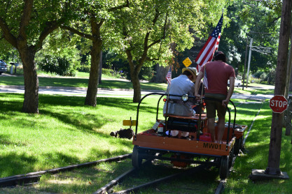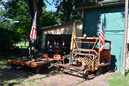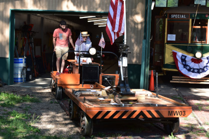 The patriotic speeders had the railroad to themselves and we would wait for them to return before we could start our trip. On the flat car were track equipment tools used by the railroad but have display signs on them.