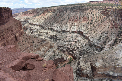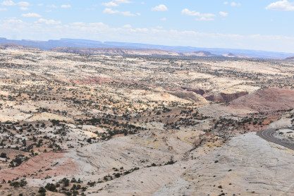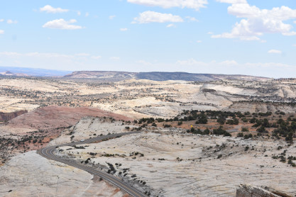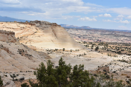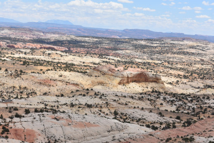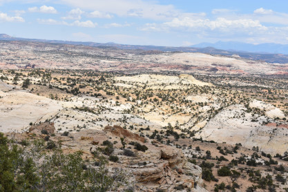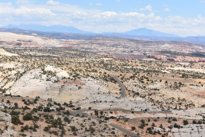 The panoramic views from the Head of the Rocks. From this vantage point, one can see all the way from the Aquarius Plateau along the northern horizon to Navajo Mountains on the Utah-Arizona border. The vista encompasses a maze of deep, winding canyons that form the Escalante River Basin.