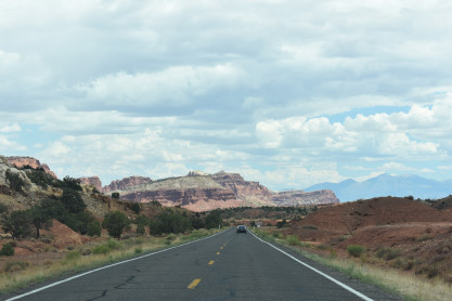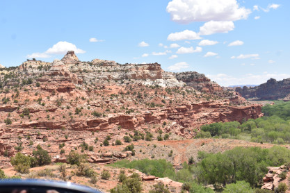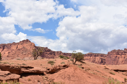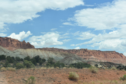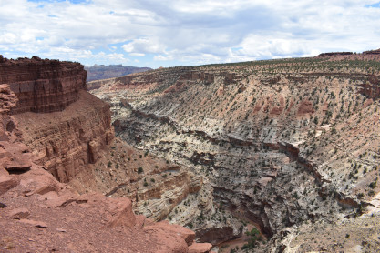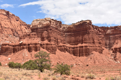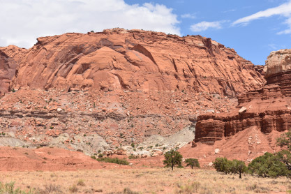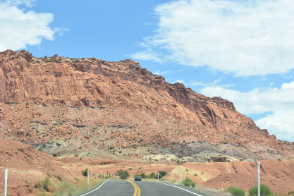 We have entered Capitol Reef National Park. The park is approximately 60 miles long on its north-south axis and just 6 miles wide on average. The park was established in 1971 to preserve 241,904 acres of desert landscape and is open all year, with May through September being the highest visitation months. Partially in Wayne County, Utah, the area was originally named "Wayne Wonderland" in the 1920s by local boosters Ephraim P. Pectol and Joseph S. Hickman. Capitol Reef National Park was designated a national monument on August 2, 1937, by President Franklin D. Roosevelt to protect the area's colorful canyons, ridges, buttes and monoliths; however, it was not until 1950 that the area officially opened to the public. Road access was improved in 1962 with the construction of State Route 24 through the Fremont River Canyon. The majority of the nearly 100 mile long up-thrust formation called the Waterpocket Fold - a rocky spine extending from Thousand Lake Mountain to Lake Powell - is preserved within the park. Capitol Reef is an especially rugged and spectacular segment of the Waterpocket Fold by the Fremont River. The park was named for its whitish Navajo Sandstone cliffs with dome formations - similar to the white domes often placed on capitol buildings - that run from the Fremont River to Pleasant Creek on the Waterpocket Fold. Locally, reef refers to any rocky barrier to land travel, just as ocean reefs are barriers to sea travel.