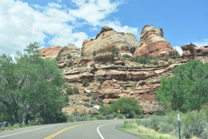 My lovely wife Elizabeth at Inspiration Point. We then went to the Visitor Center where Elizabeth acquired a couple of magnets, a lapel pin and a Christmas ornament. We left the park and drove out west to a roundabout where I made a wrong exit and was now on Utah Highway 12, which worked out just fine. This road took us through Tropic, Cannonville and Henrieville.