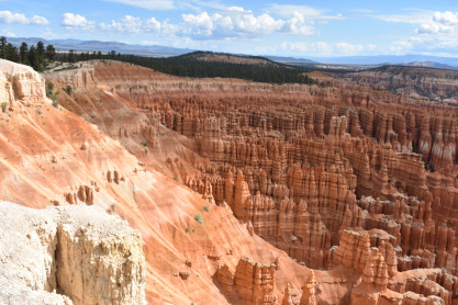 Bryce Canyon National ParkBryce Canyon National Park is an American national park located in southwestern Utah. The major feature of the park is Bryce Canyon, which despite its name, is not a canyon, but a collection of giant natural amphitheaters along the eastern side of the Paunsaugunt Plateau. Bryce is distinctive due to geological structures called hoodoos, formed by frost weathering and stream erosion of the river and lake bed sedimentary rocks. The red, orange and white colors of the rocks provide spectacular views for park visitors. Bryce Canyon National Park is much smaller, and sits at a much higher elevation than nearby Zion National Park. The rim at Bryce varies from 8,000 to 9,000 feet.