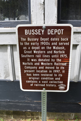 The Bussey depot sign. Now we would find the covered bridge in this park.