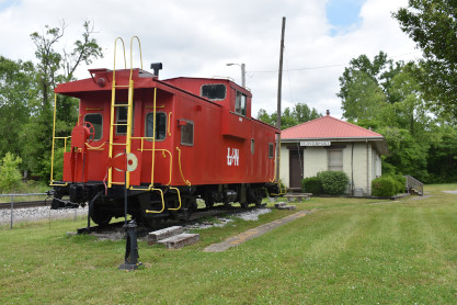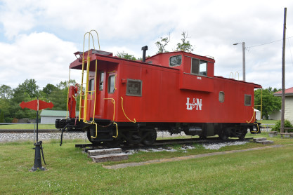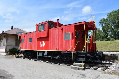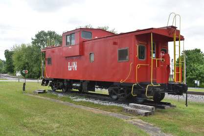 Chesapeake and Ohio caboose, number unknown, built by International Car and painted as Louisville and Nashville in Hawesville.