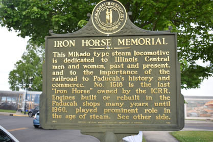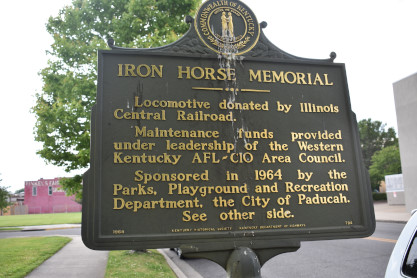The Iron Horse Memorial sign. Along the floodwall are many murals about Paducah's history.