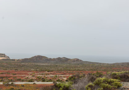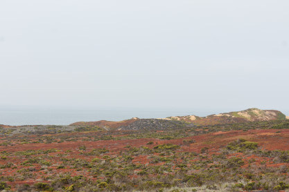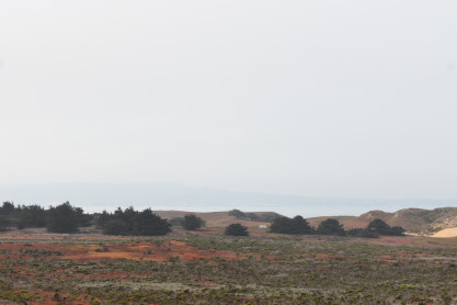 A view with the Pacific Ocean behind the sand dunes.