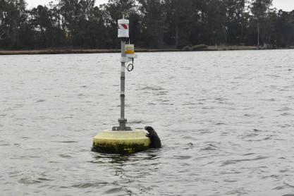 A baby otter trying to climb the buoy.