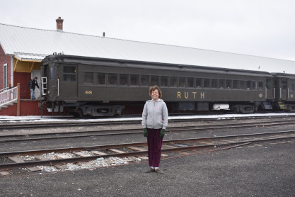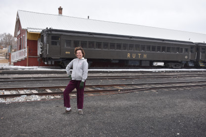 One of the photographers asked Elizabeth if her name was Ruth. She replied that it was one of her middle names. So we both took a picture of her in front of Nevada Northern coach 08 "Ruth", ex. Nevada Northern 08 "Nevada, exx. Nevada Northern Railway 1439, exxx. Willamette and Pacific 1439 1993, exxxx. Lewis and Clark Railway 1439 1989, exxxxx. Magnolia State Railroad 1439 1981, exxxxxx. Crab Orchard and Egyptian 1439 "Franklin" 1973, nee Illinois Central trailer 1439 built by Pullman Company in 1928 for IC suburban service.