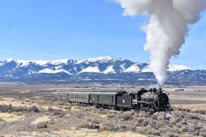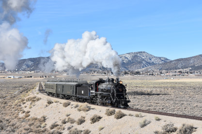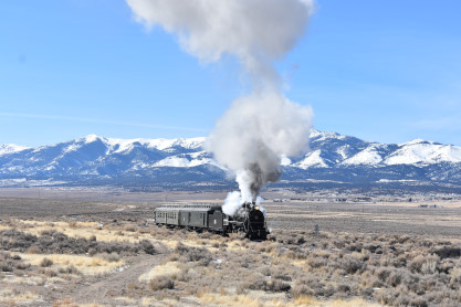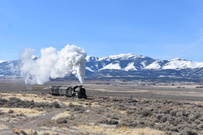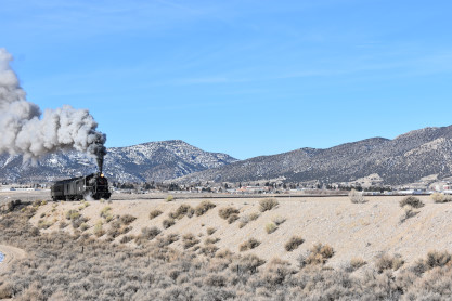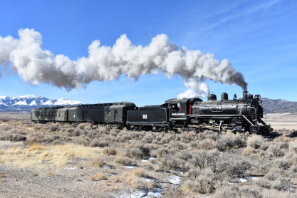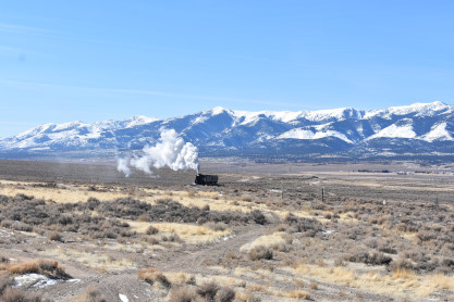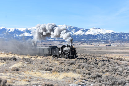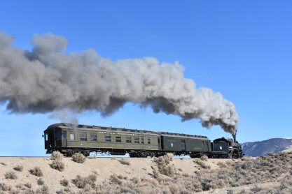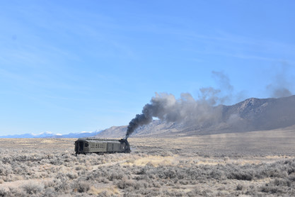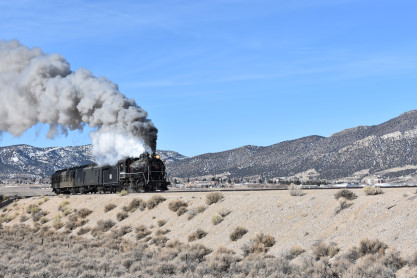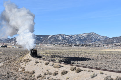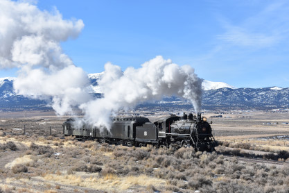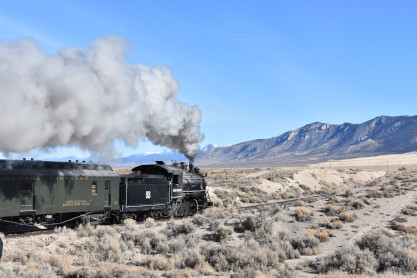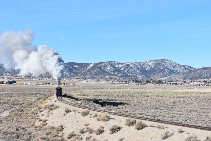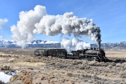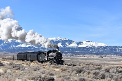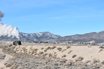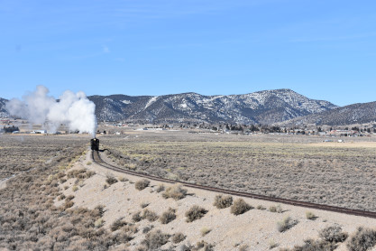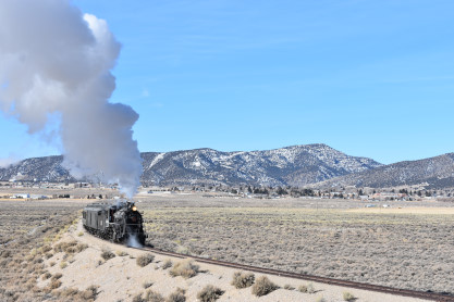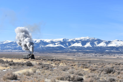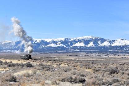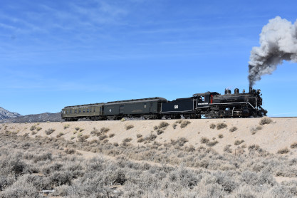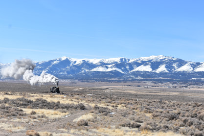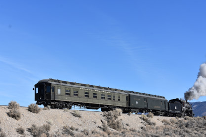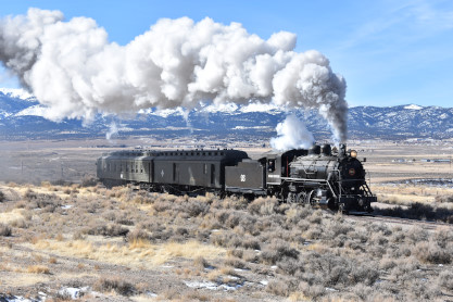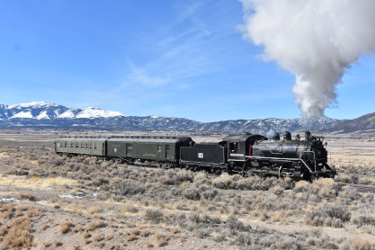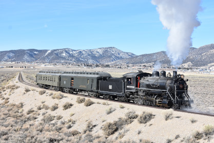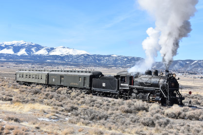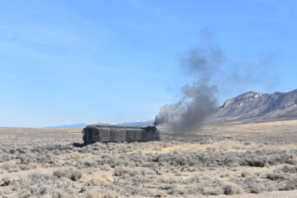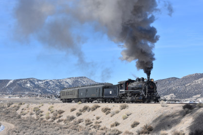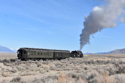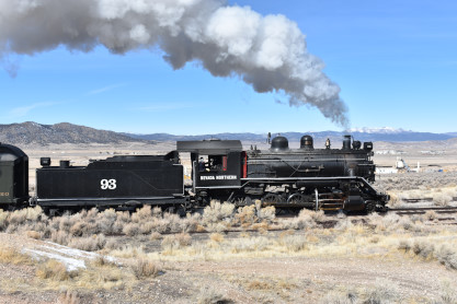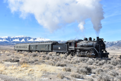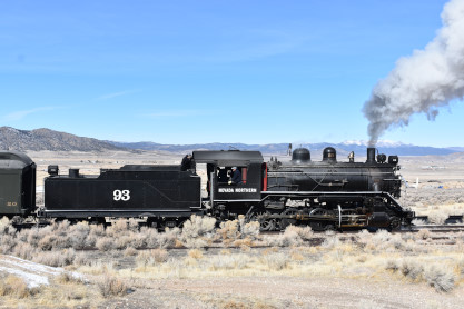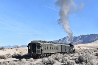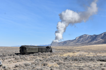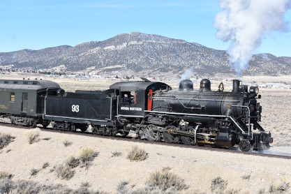 The steam engine on the front of the train. I was the first person aboard the train today and found seats at the rear of combine 5. The equipment had air brake problems which delayed our departure this morning. After one final air test, we departed Ely at 8:52 AM. These cars were unheated but with the sun shining in, they warmed up quite nicely. The train ran out to the Moser Cut and we all detrained for the first photo runby of the day.