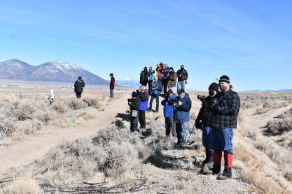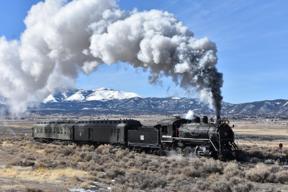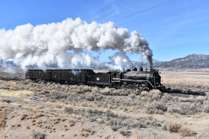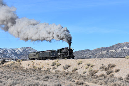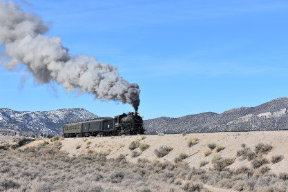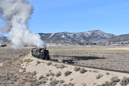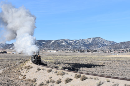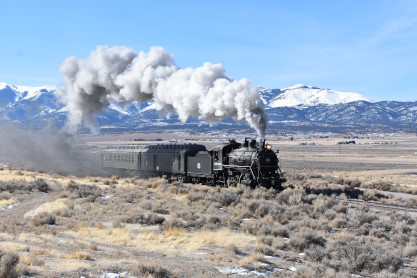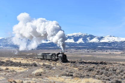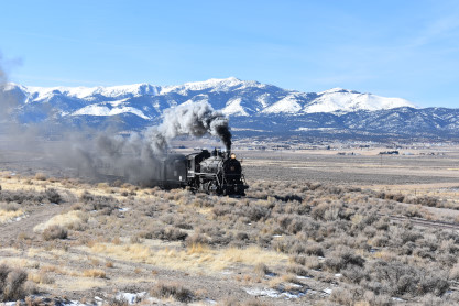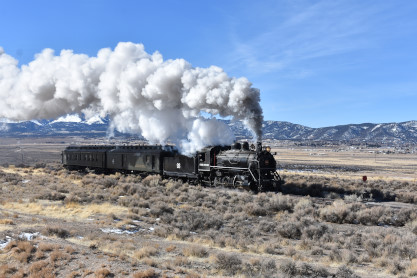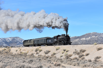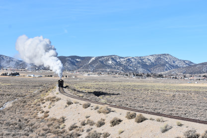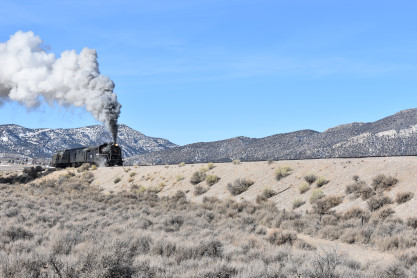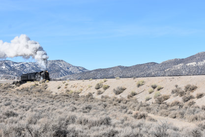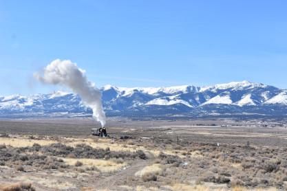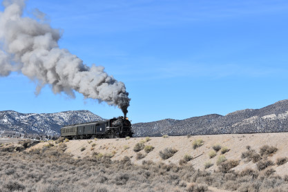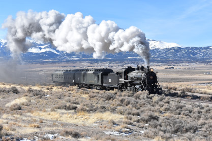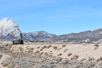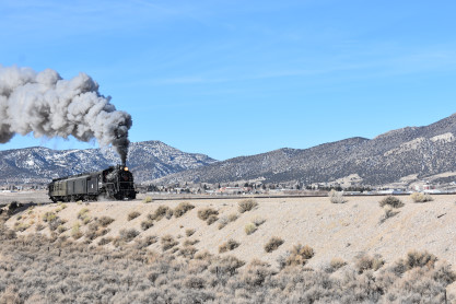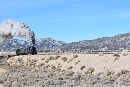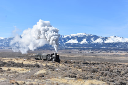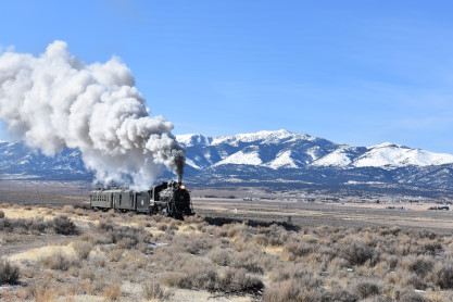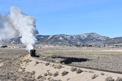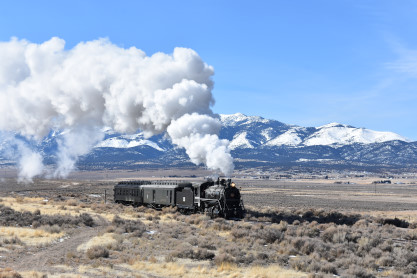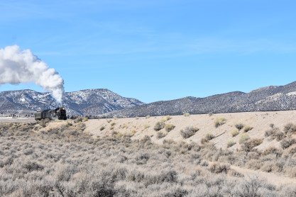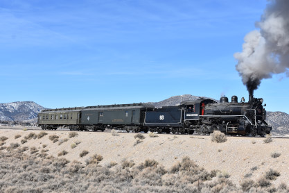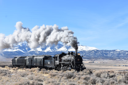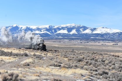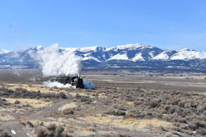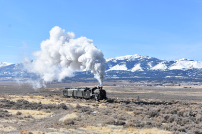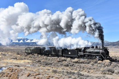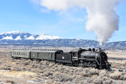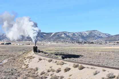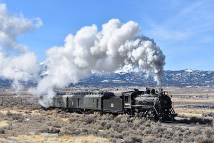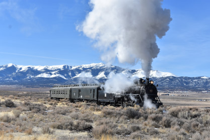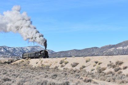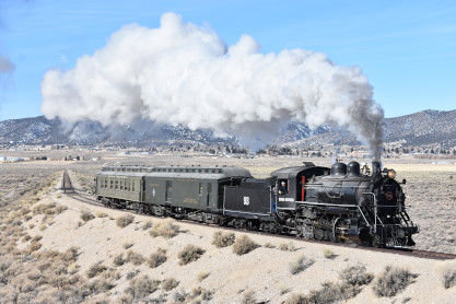 The steam engine on the front of the train. I was the first person aboard the train today and found seats at the rear of combine 5. The equipment had air brake problems which delayed our departure this morning. After one final air test, we departed Ely at 8:52 AM. These cars were unheated but with the sun shining in, they warmed up quite nicely. The train ran out to the Moser Cut and we all detrained for the first photo runby of the day.