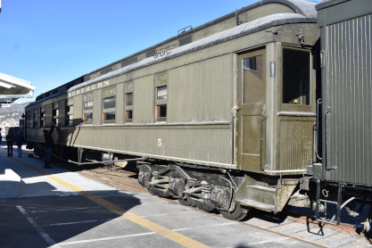 Nevada Northern coach 5, nee Pullman wooden drawing room/12 section sleeping car "Silesia" built by Pullman Chicago Works in 1882 for the Pullman-Union Pacific Association. It was withdrawn from UP Association use in April 1898 and subsequently sold to Hotchkiss, Blue and Company. The Nevada Northern Railway purchased it second hand in January 1913 for $1,500.00 plus an additional $197.60 in freight charges for shipment from Chicago, Illinois to Cobre, Nevada. It was apparently designated as coach 03 on the Nevada Northern roster until its conversion from a Pullman sleeper to first class coach (chair car) 5 (with smoking and non-smoking sections) between 31 December 1917 and 31 May 1918 at a cost of approximately $8,900. Kennecott Copper Corporation donated it to the Nevada Northern Railway Museum in 1986. It was part of the White Pine Public Museum, but returned to Nevada Northern Railway with the trade of Cherry Creek Depot, which is displayed at that museum today.